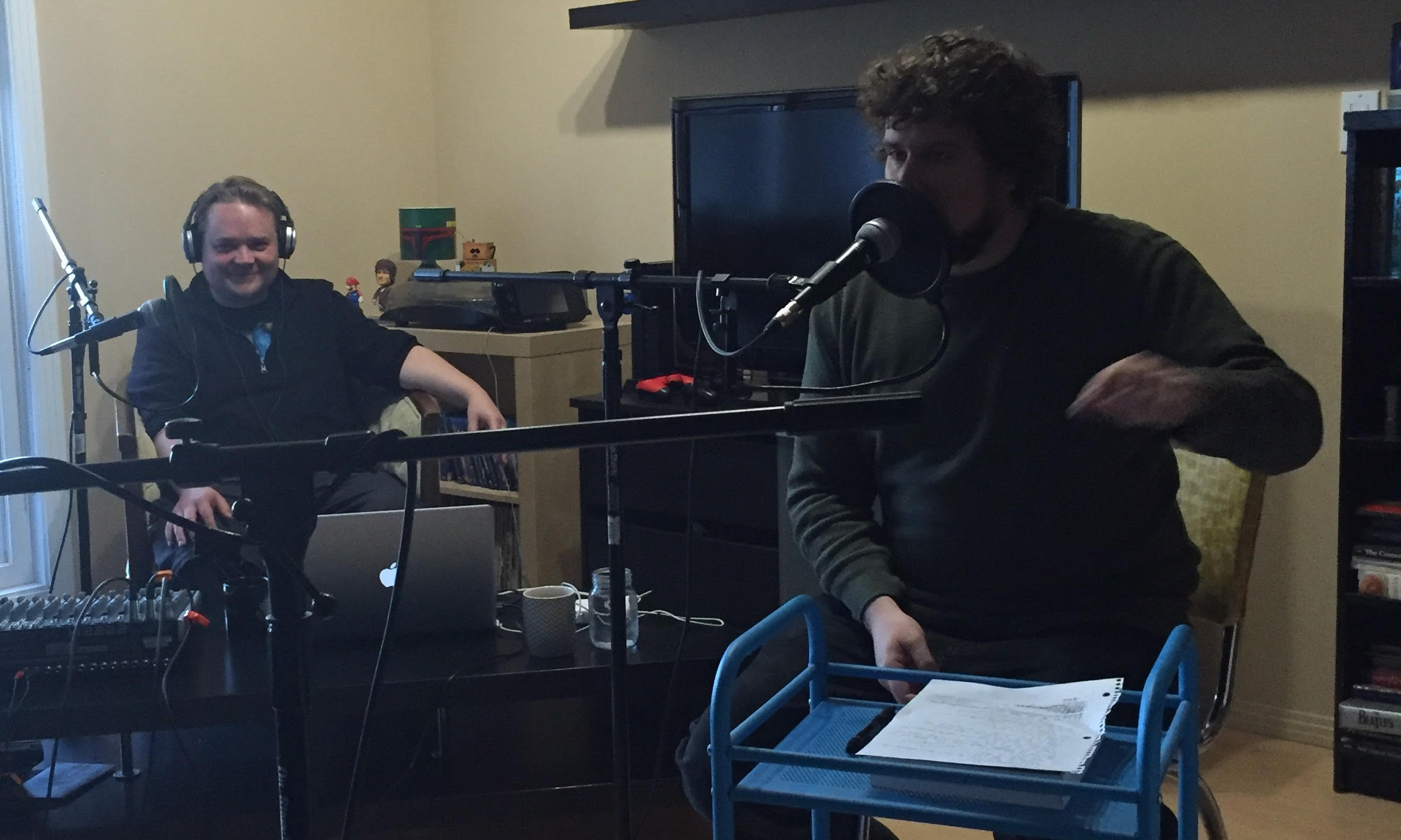 Brian Bergum and Taylor Chadwick make podcast magic for What It Is in the living-room studio.